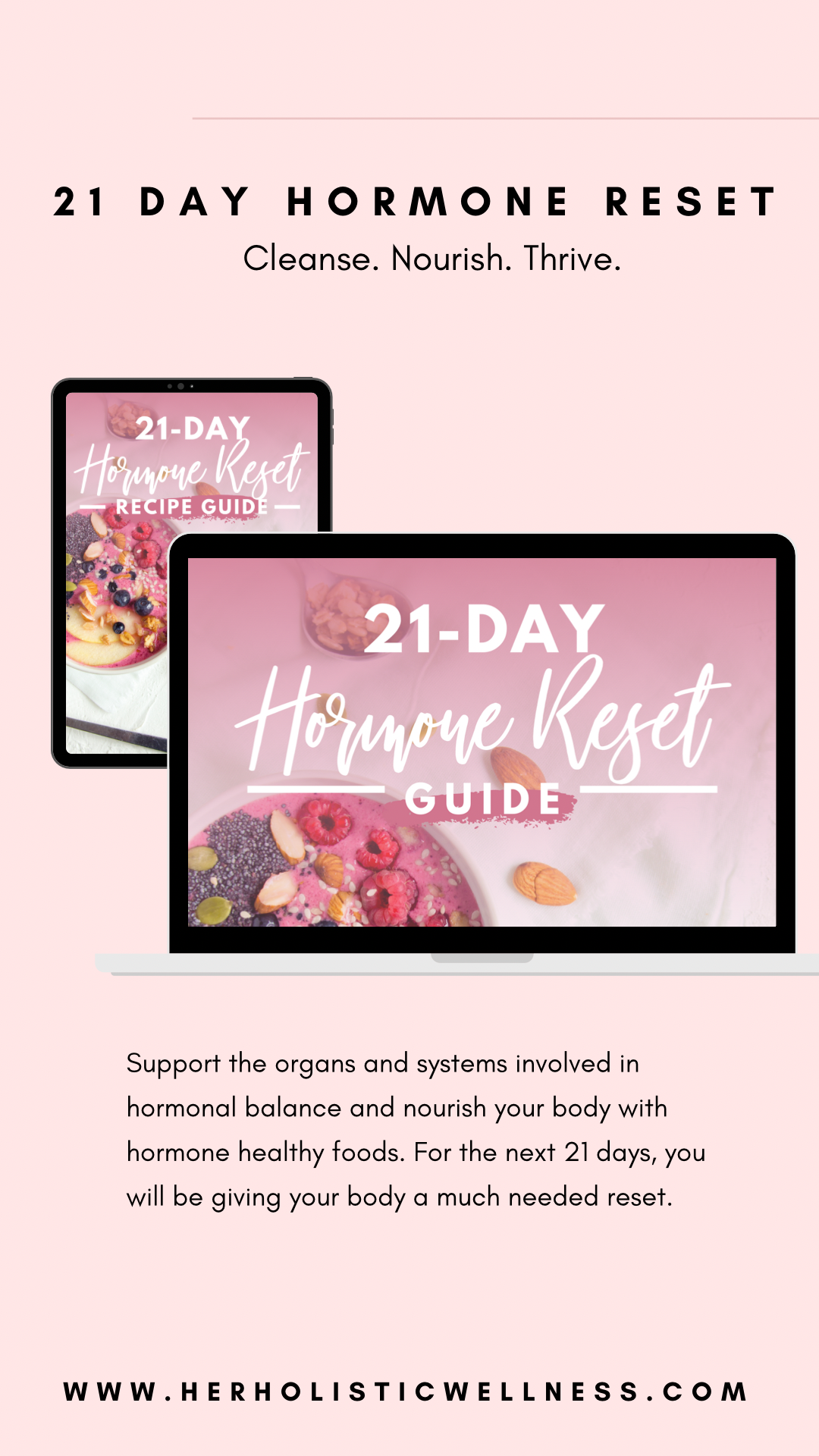 My 21 Day Hormone Reset is a nourishing protocol that focuses on replenishing the nutrients that your body needs for hormonal health, while simultaneously reducing the amount of nutritional and environmental clutter that comes into your body. Some of this "clutter" can include chemicals, sugar, caffeine, and the hormones, pesticides, and herbicides found in many foods.
